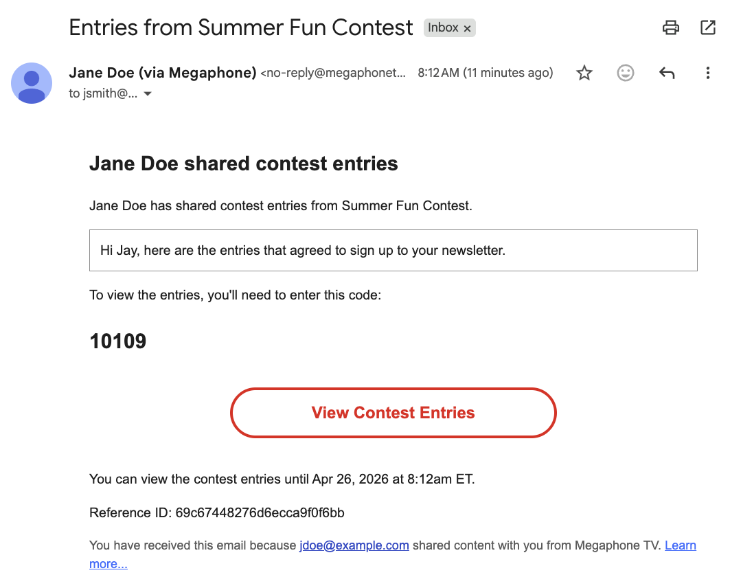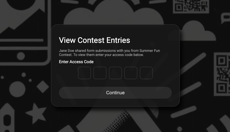 To view contest entries, the person you shared with clicks the "View Contest Entries" button in the email and enters their access code.