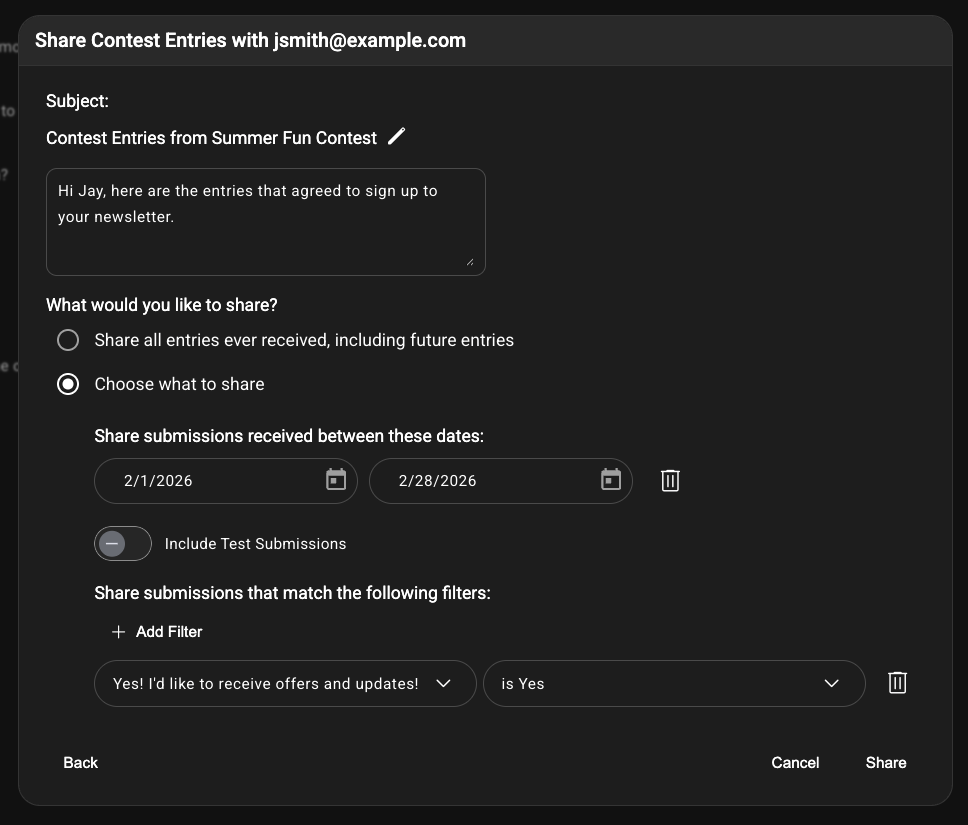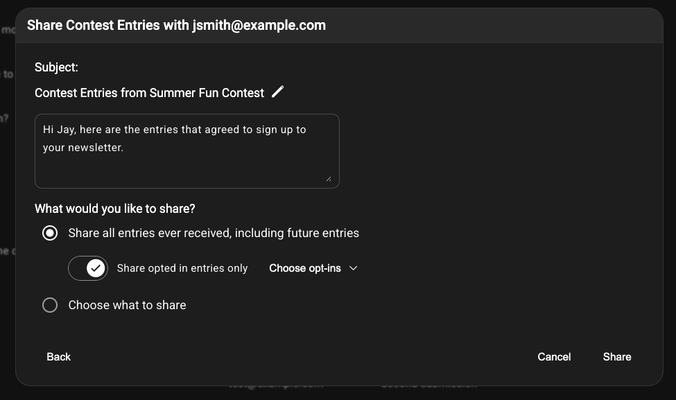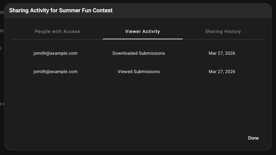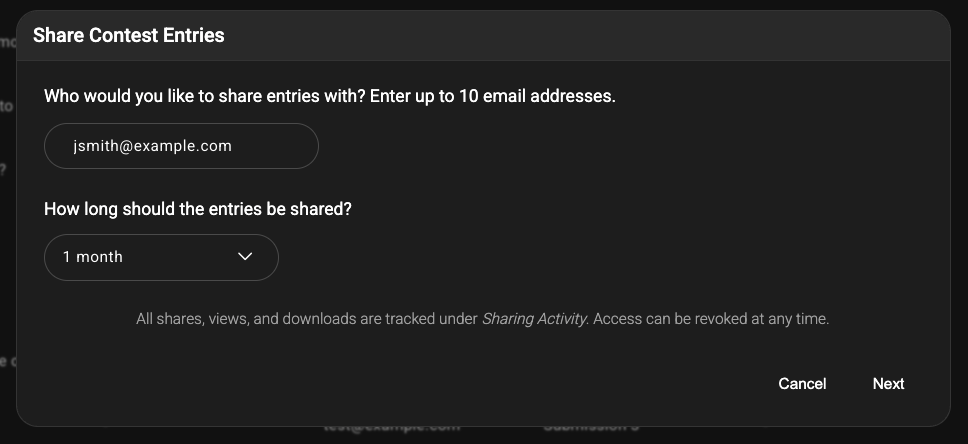 An email with the entries you shared will be sent to the person you shared them with. That person will be granted access to a portal for viewing, searching, and downloading the entries. If someone enters the contest after you share entries, the list of shared entries will update automatically, so there's never a need to "re-share.".